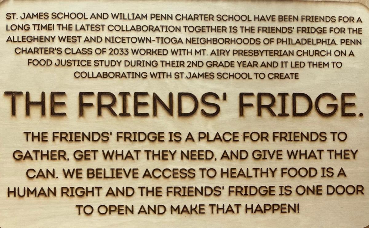 The project came about when Penn Charter’s current 3rd graders began working on a Food Justice Study with Mt. Airy Presbyterian Church during their 2nd grade year. The idea of a community fridge was discussed, and Alyson Goodner, Director of Penn Charter’s Center for Public Purpose, reached out to The Welcome Table at St. James about collaborating.