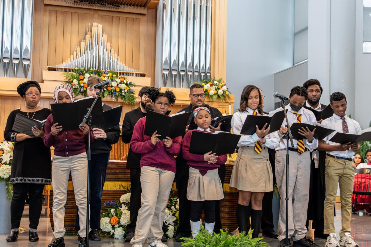 The St. James Choirs singing at the Absalom Jones Mass at Episcopal Academy, led by Javvieaus Stewart, Director of Choral Music & Music Education
