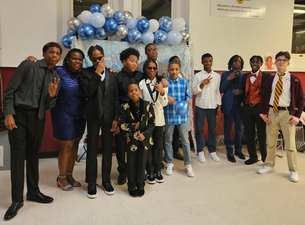 Upper School students in their party finery at the Winter Dance, posing for pictures in front of a balloon-festooned backdrop