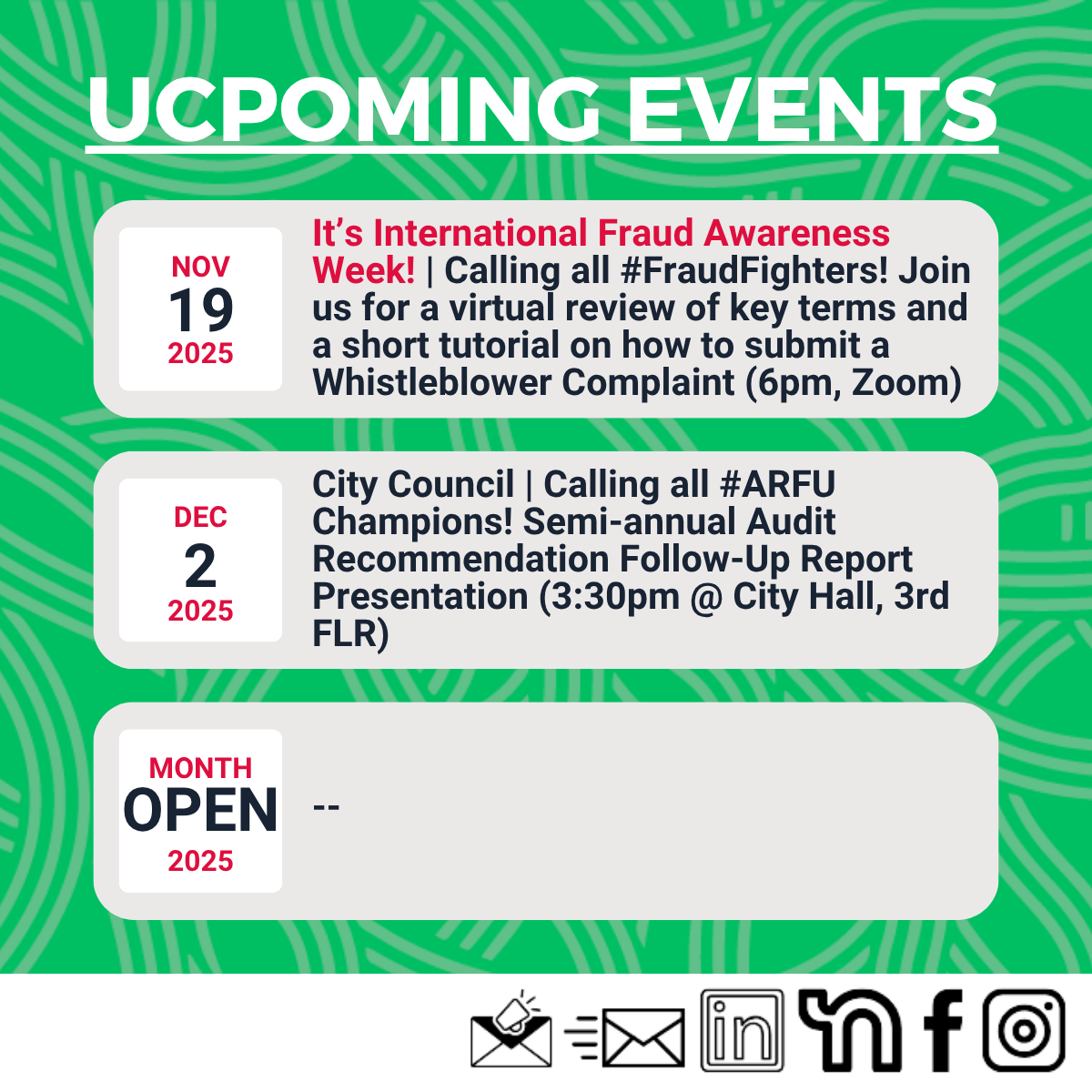The City Auditor’s Office remains committed to upholding the highest standards of ethical conduct and transparency to maintain your trust in our government. Thank you for your continued support and commitment to good governance.