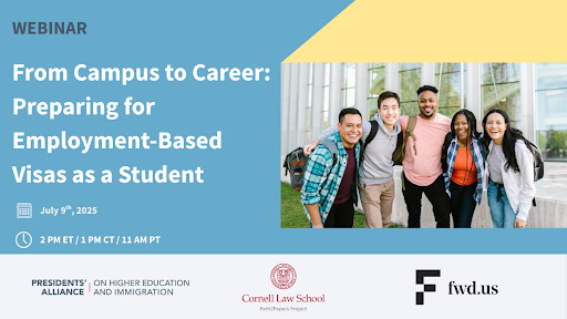 | Webinar – From Campus to Career: Preparing for Employment-Based Visas as a Student – July 9 at 2 PM ET | Join the Presidents’ Alliance, Path2Papers, and FWD.us for an upcoming webinar introducing these new resources and providing an overview of employment-based visa pathways, such as H-1B, O-1, and employment-based green cards. Panelists will discuss concrete steps students can take now, strategies for securing sponsorship, and where to find additional support and free legal consultation opportunities. Speakers include: Anita Gupta (Presidents’ Alliance), Raju Patel (Path2Papers), Ali Procopio (FWD.us), and Dan Berger (Green and Spiegel / Path2Papers). | | |