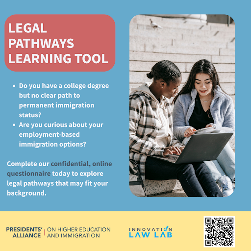 This confidential online questionnaire is designed to help students and graduates in temporary or precarious statuses explore potential employment-based immigration pathways and learn more about each one. Developed by legal experts and in partnership with Innovation Law Lab, the tool guides users toward appropriate next steps, including seeking legal counsel. We encourage you to share this directly with students.