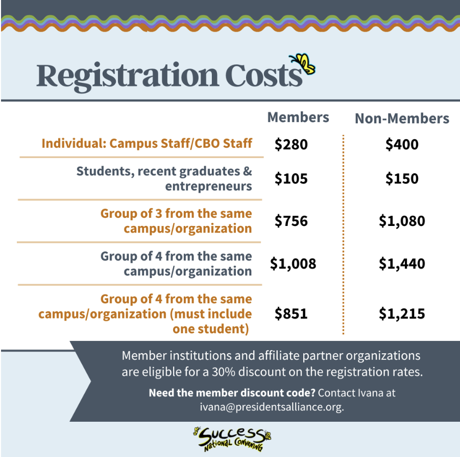 Presidents' Alliance member campuses and affiliate partner organizations are eligible for a 30% discount on the registration rates until registration closes.
