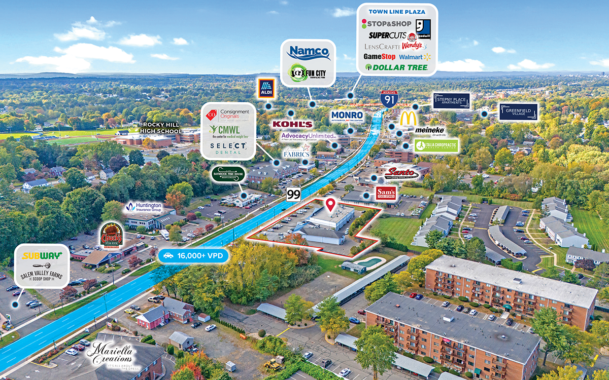 STRATEGIC LOCATION: The Property benefits from a convenient location less than a mile from Interstate 91, which provides convenient access to Hartford (6-miles) and all areas of the state. The intersection of Silas Deane Highway with Interstate 91 serves as the center a of robust trade area on the border of Rocky Hill with Wethersfield. Major anchors for the trade area include Walmart, Stop & Shop, TJ Maxx, and Kohl’s, and are surrounded by national retailers and local businesses that drive traffic to the area.
