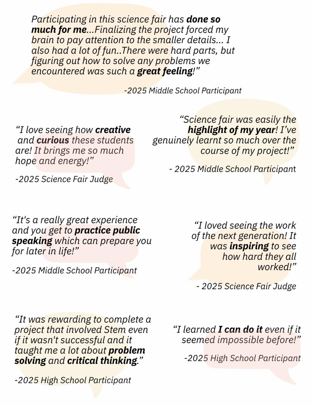 As we close out the 2024–25 fair season, we’re taking time to reflect, evaluate, and refine. Our team is currently reviewing program feedback and outcomes from across the state, and we look forward to sharing a full Impact Report later this summer. In the mean time here is a peek at some of the comments we have had the joy of reading! | Thank you for being part of such a positive and impactful community. We always love hearing from you—don’t hesitate to reach out. Until next time, stay curious! | | |