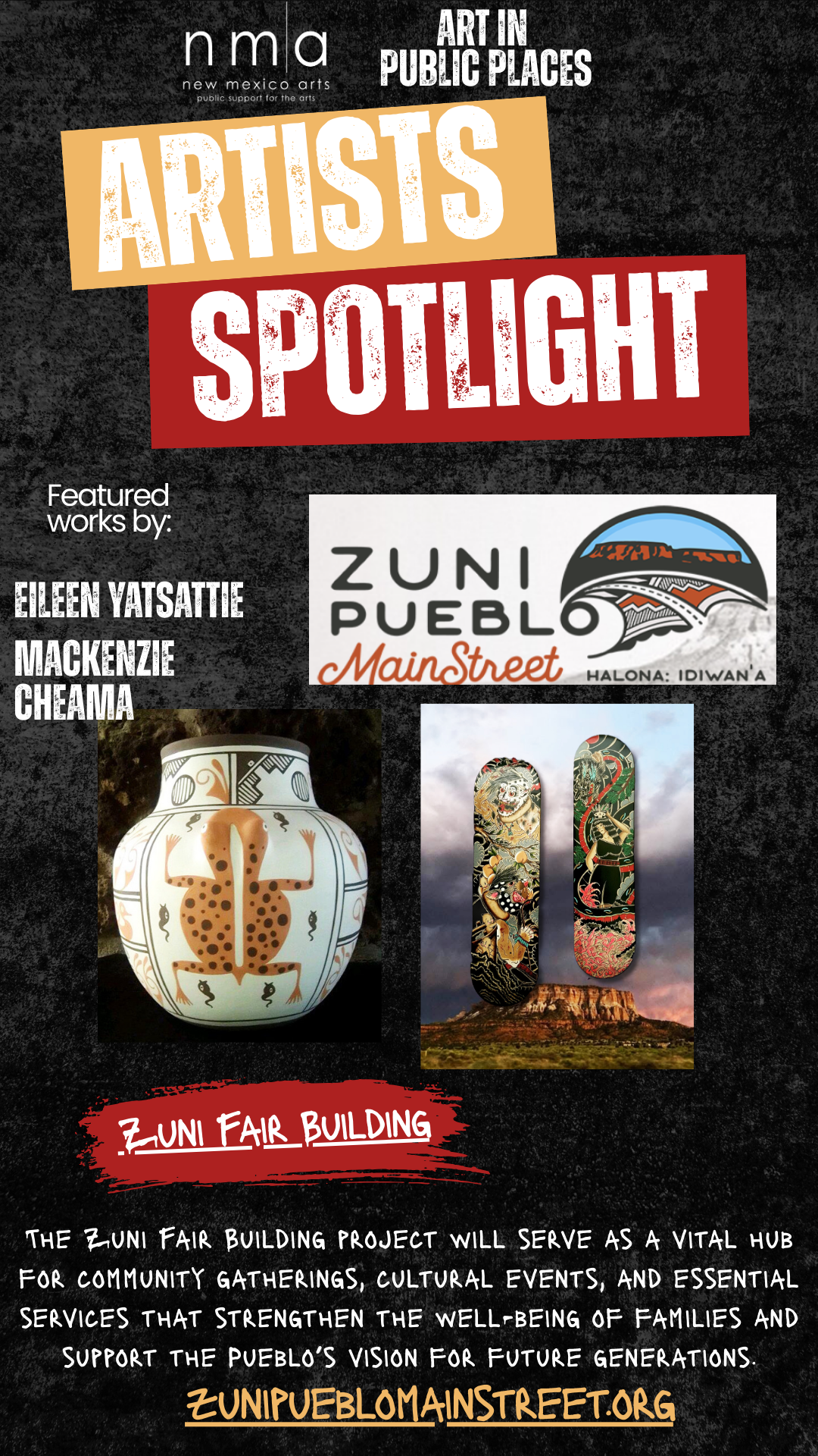 Fifteen artists were acquired through the Art in Public Places process for the building including Christopher, Natachu, Deldrick Cellicion, Douglas Martza, Eileen Yatsattie, Edward W. Wemytewa, Eldred Martinez, Georgean Hughte, Jonathan Dewa, Justin Natewa, Keith Edaakie, Lakin Espaloose, Leanne Lee, Levon Loncassion (@loncassion), Mackenzie A. Cheama (@xgentsmcflyx), and Terrance B. Smith.