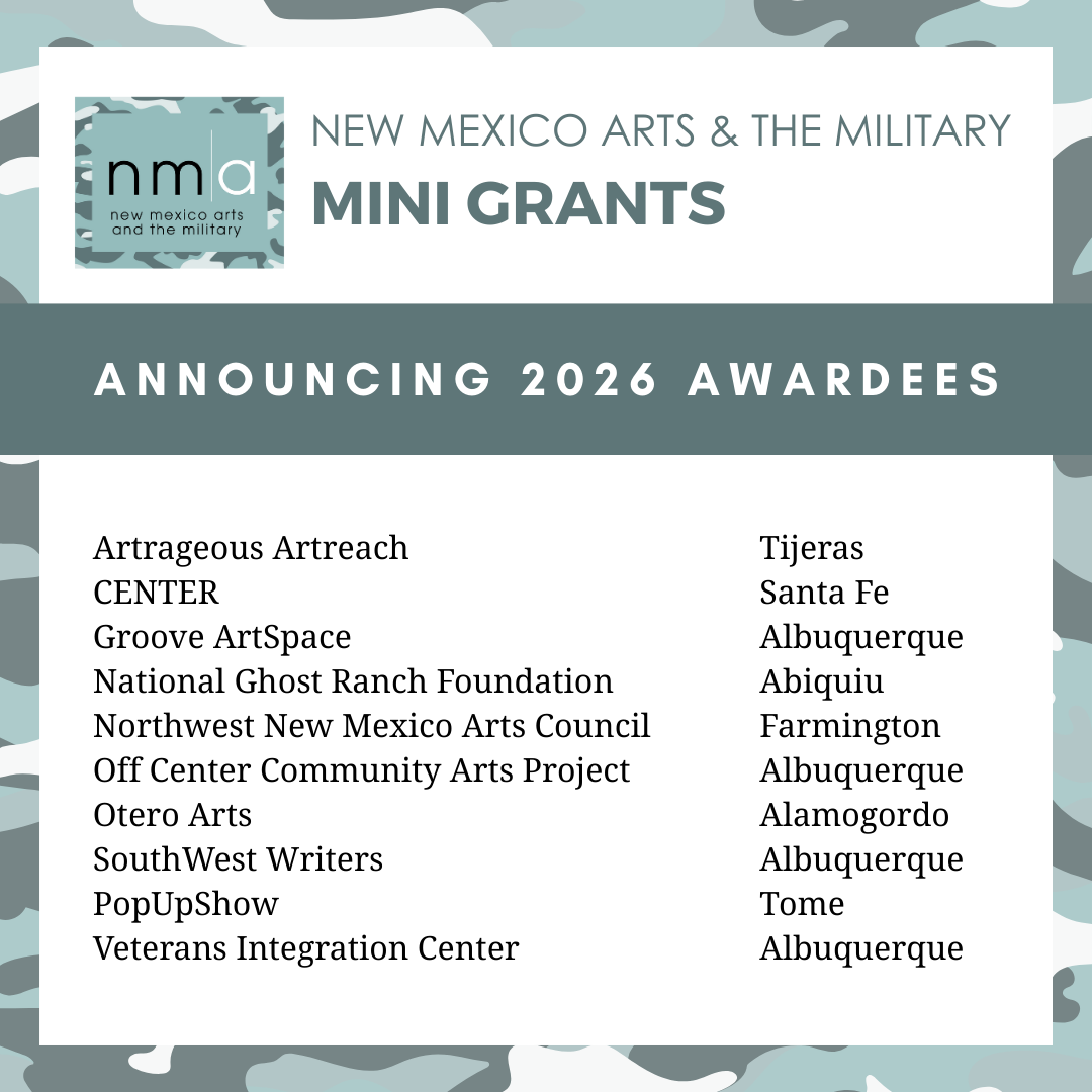 The $2,500 Mini Grants program assists organizations creating and expanding arts programming for military connected participants via a streamlined granting process. Mini Grants can also be used to build organizational capacity towards the goal of creating and expanding opportunities for veterans and active-duty service members to engage in the arts. Non-Arts organizations and organizations receiving New Mexico Arts funding in other grant programs can also apply (FALL 2026) for this New Mexico Arts and the Military Grant opportunity.