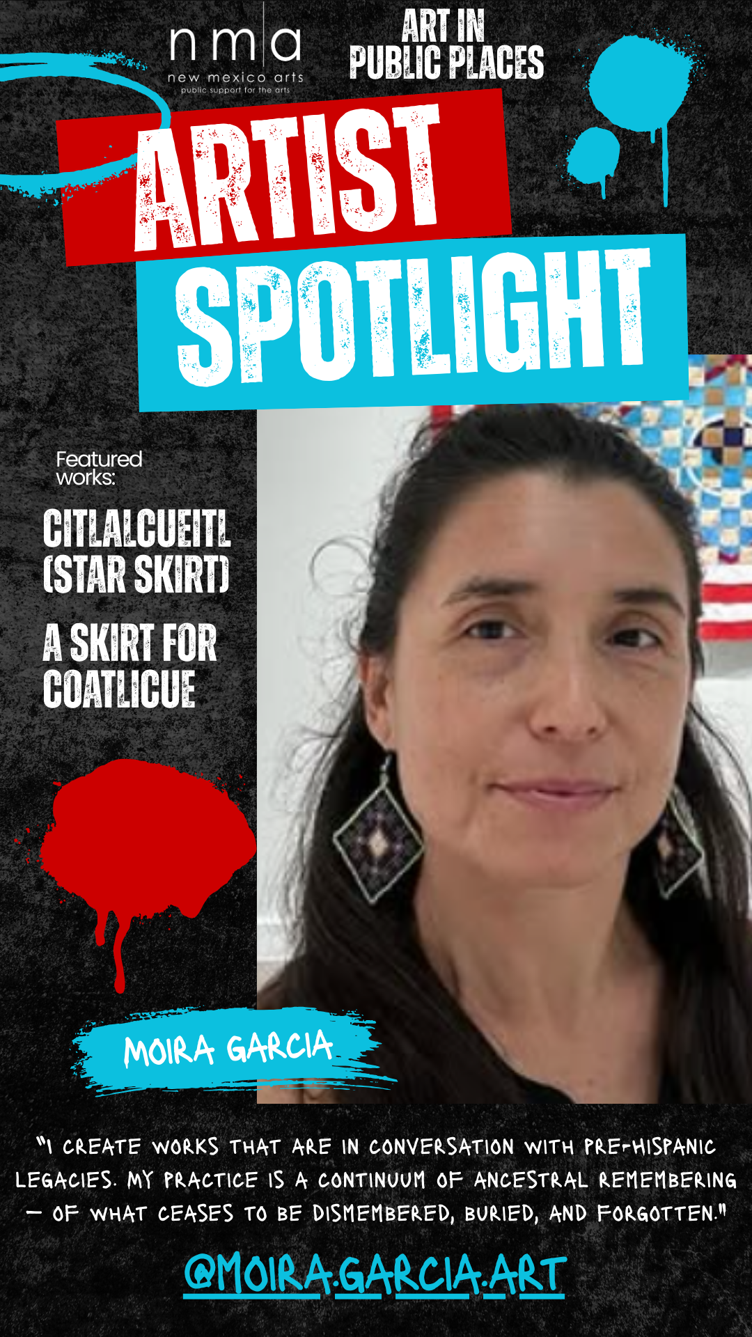 Moira Garcia a multidisciplinary Chicana artist, educator, and native of New Mexico. She holds a BFA in Studio Arts with a focus in Printmaking from the Institute of American Indian Arts and a Master’s in Latin American Studies with concentrations in Latin American Art History and Indigenous Studies from the University of New Mexico. Her work is a visual language of symbol, color, and metaphor that references and interprets ancient visual culture and cosmologies. Moira's interest in Mesoamerican art developed during her early childhood experiences in Mexico and continues to be the primary inspiration in her practice today. Based on her study of Nahuatl language and Mesoamerican artistic praxes, she creates works that are in conversation with pre-Hispanic legacies. Her practice is a continuum of ancestral remembering— of what ceases to be dismembered, buried, and forgotten. By means of recreating aesthetic qualities, materials, design, and iconographies, she is interested in revisibilizing artistic traditions that were destroyed during colonization and remain largely unrecognized in contemporary culture.