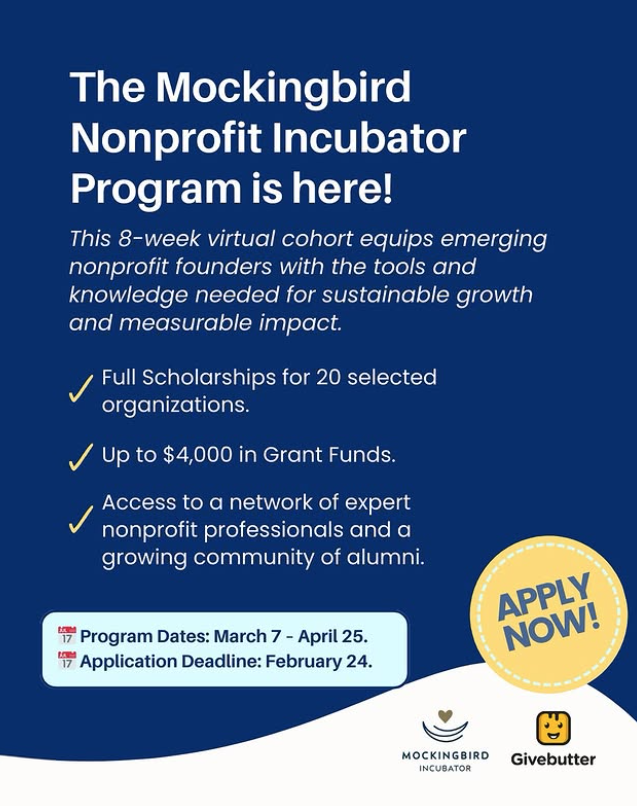 In partnership with Givebutter, the Mockingbird Incubator Program provides 20 nonprofit organizations with the tools and resources to help them run scalable nonprofits that make a difference.