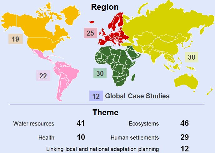 In accordance with the mandate of SBSTA 40, the secretariat invited Parties and NWP partner organizations to contribute case studies on good practices and lessons learned on ecosystems, water resources, health, human settlements, and on linking national and local adaptation planning. In total, the secretariat has received 138 case studies thus far. In the graphical representation below, case studies have been grouped into region and theme. However, most of these case studies are cross-cutting, relevant to more than one theme.