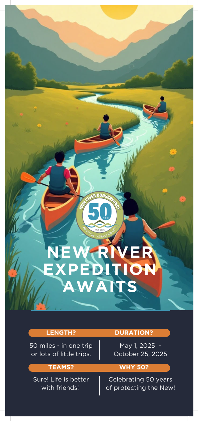Join the New River Expedition, a paddling adventure and peer-to-peer fundraising event that gives paddlers a way to protect the New River watershed while having an adventure on the New. We're celebrating by doing 50 miles on the New River for our 50th Birthday! Each paddler that completes 50 miles receives a special edition paddle medallion.