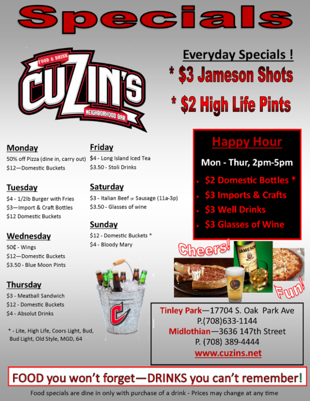 | We DELIVER! Give us a Try! Rated 4th Best Pizza all Chicago Suburbs by Channel 7 Food critic Steve Dolinsky- aka The Food Hound Tinley Park - (708)633-1144 Midlothian - (708)389-4444 www.cuzins.net Delivery to Tinley Park, Orland Hills, Oak Forest, Midlothian, Crestwood & Posen |