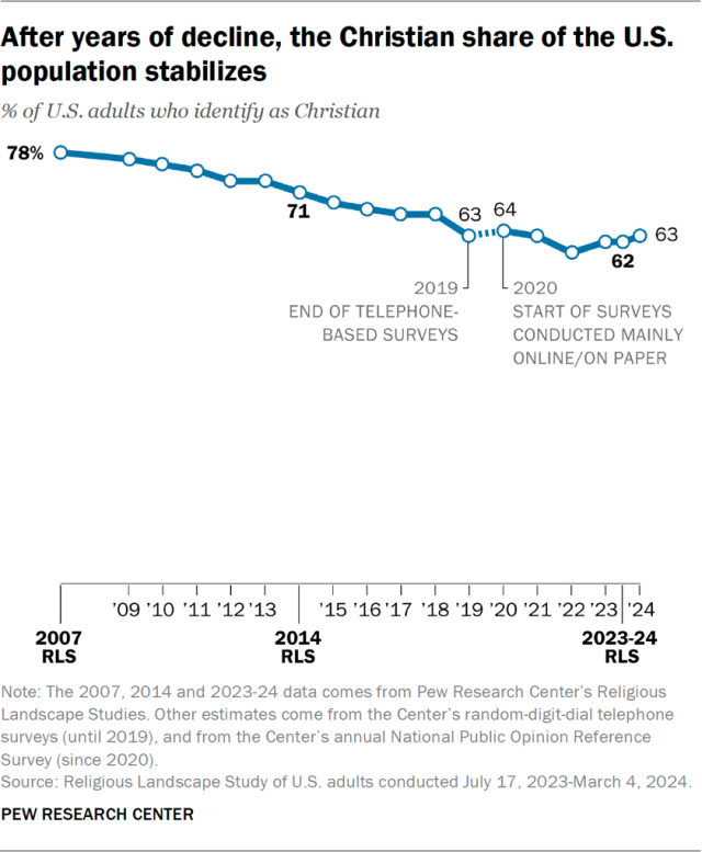 For decades, Christianity’s share of the U.S. population has been shrinking, while the number of religiously unaffiliated people—often called “nones”—has surged. But new data from Pew Research Center’s massive 2023-24 Religious Landscape Study suggests something surprising: those trends may be leveling off. |