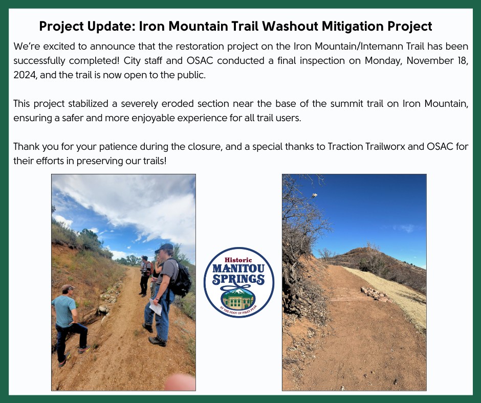 The City of Manitou Springs announced the completion of the Iron Mountain- Intemann Trail restoration project. City staff and the Open Space Advisory Committee conducted a final inspection on Monday, November 18, 2024, and the trail is now open to the public.