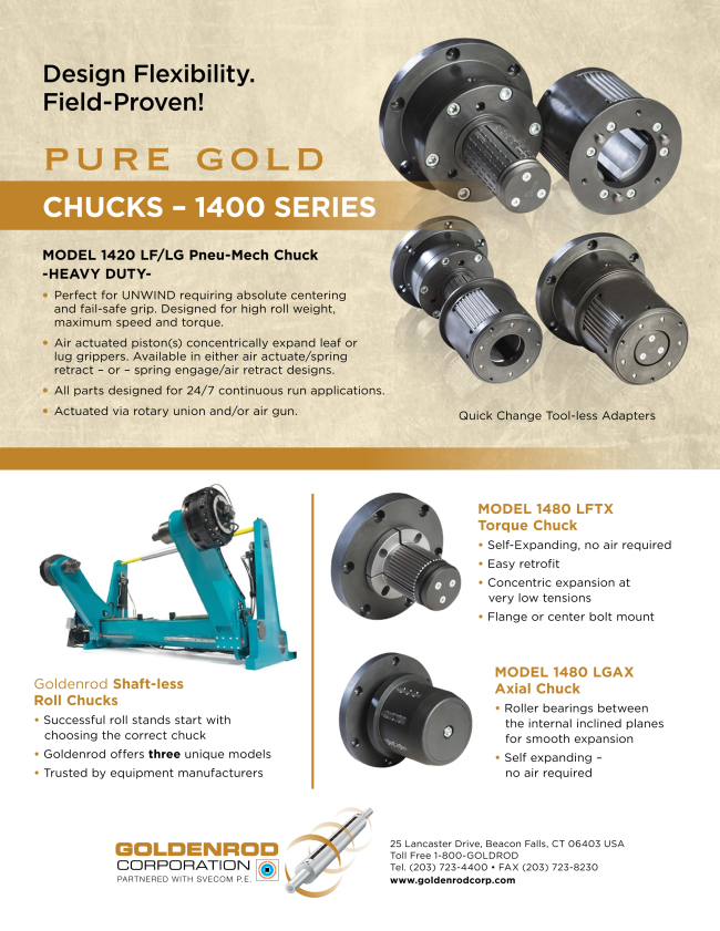 Since 1986, Goldenrod has been designing and manufacturing industry-leading differential winding shafts, multiple bladder air shafts, lightweight aluminum and carbon fiber shafts, reel spools,chucks, and safety chucks for the paper, plastics, film, and foil converting industries. The company is partnered with Svecom PE of Italy, the largest manufacturer of air shafts and core holding equipment in Europe.