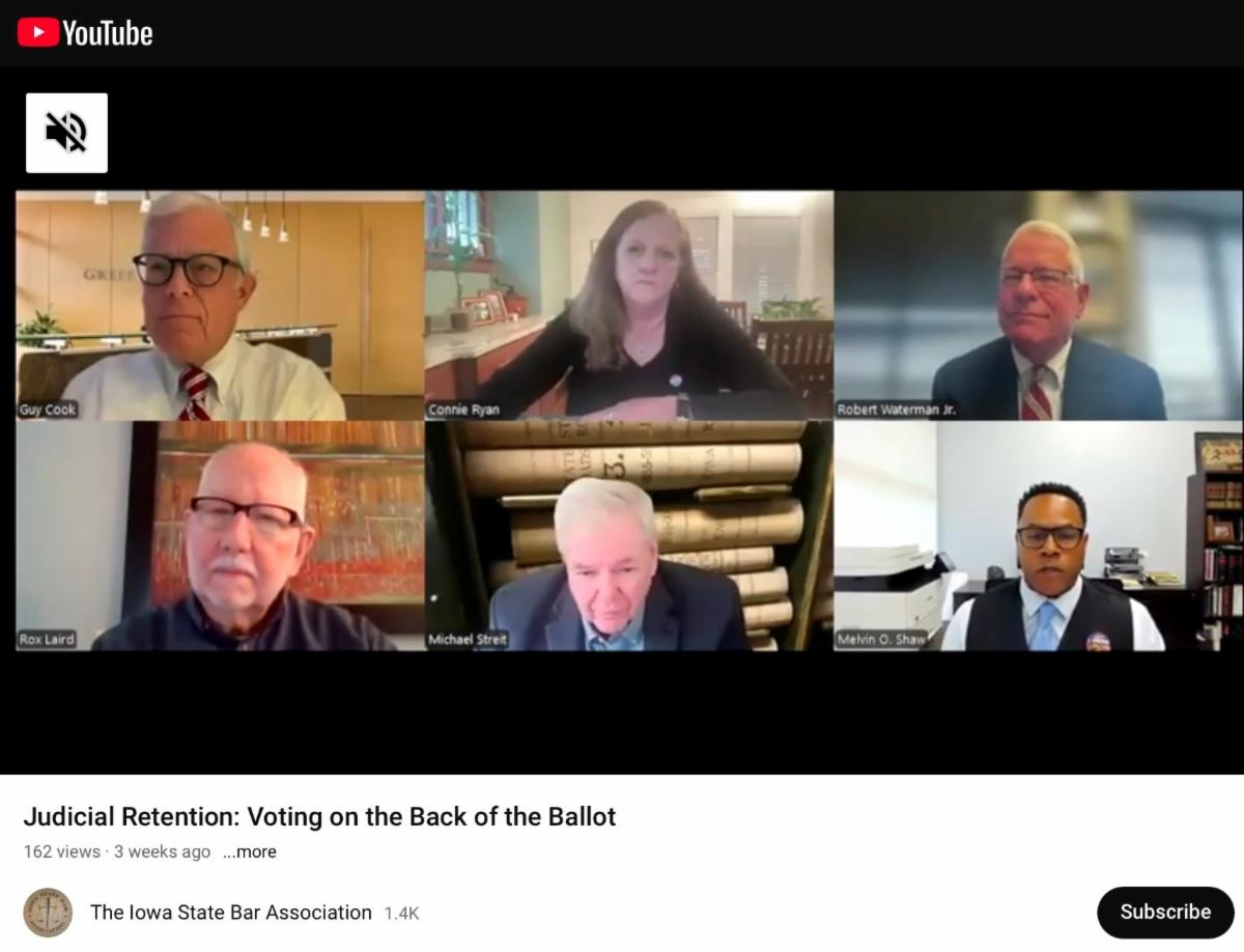 Former Iowa State Committee Chair Bob Waterman moderated the ISBA’s 60-minute CLE Webinar “Judicial Retention: Voting on the back of the Ballot,” held October 30, 2024, and available now on YouTube. The panelists were former Iowa Supreme Court Justice Michael Streit, ISBA Past President and Chair of the Independence of the Judiciary Committee, Guy Cook, President of Justice Not Politics, Connie Ryan, Des Moines Register Editorial Board Member, Rox Laird, and current ISBA President Melvin Shaw. The purpose of the Webinar was to clarify the judicial retention process and what a “yes” or “no” vote means, in advance of the November 5, 2024 election.
