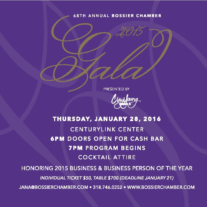 Be a part of the Bossier Chamber of Commerce's premier event and the largest networking event in NWLA! We will celebrate the successes of 2015 and look forward to what the coming year will bring to the Northwest Louisiana Region. It is at this event that the Chamber installs new officers and honors our community's businesses as well as outstanding chamber members with awards including the Business of the Year and Business Person of the Year. The evening is full of fun, socializing, awards and recognition with Chamber members and community leaders. The Chamber's Annual Gala attracts over 700 members and guests. Tickets may be purchased on the Bossier Chamber website. Click
