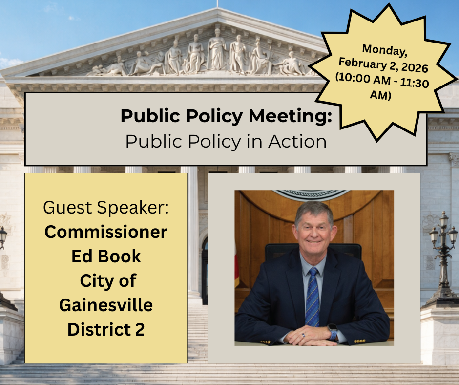 Hear directly from a local decision-maker on housing issues impacting Gainesville neighborhoods, property rights, and the future of housing policy. Stay informed, engaged, and connected to the conversations shaping our local market by attending the next Public Policy Meeting on Monday, February 2, 2026 from 10:00-11:30AM.