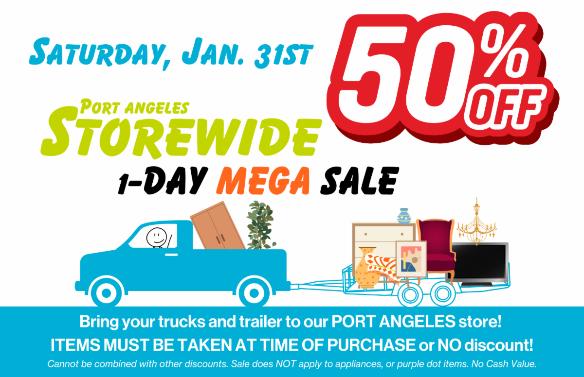 Port Angeles Store is having a MEGA SALE!!! Stop by January 31st and get your savings on!