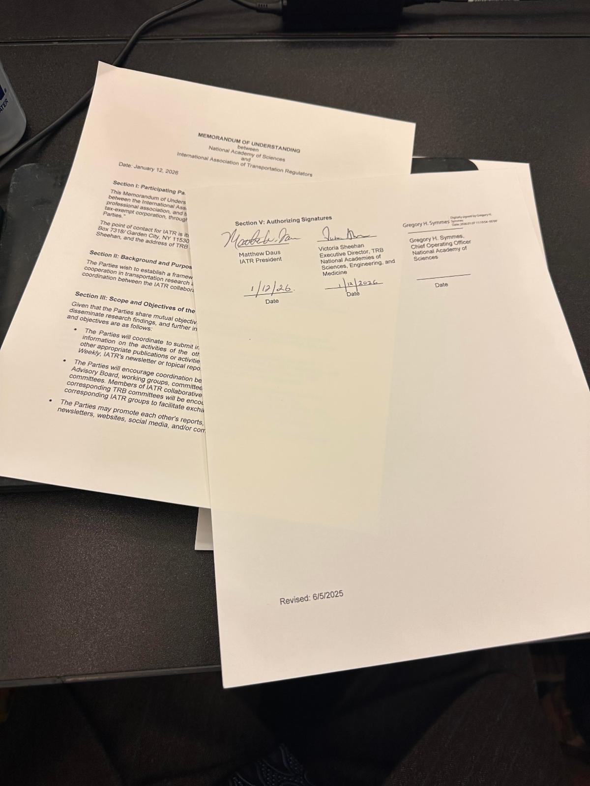 On Monday, January 12th, building on years of collaboration, IATR President Matt Daus and Transportation Research Board (TRB) Executive Director Victoria Sheehan formally signed a Memorandum of Understanding at the start of the International Subcommittee meeting. The MOU establishes a framework for ongoing collaboration, knowledge exchange, and engagement between regulators, researchers, and practitioners worldwide, and further integrates IATR into TRB’s evolving international architecture. Thanks to Victoria Sheehan; Randell Iwasaki, President of Iwasaki Consulting Services, and Chairman of the International Road Federation (IRF Global); Caroline Alméras, Secretary General of the European Conference of Transport Research Institutes (ECTRI); and Christos Xenophontos, Assistant Director of Administrative Services at Rhode Island Department of Transportation; for their leadership, collaboration, and sustained efforts in bringing this MOU to fruition.