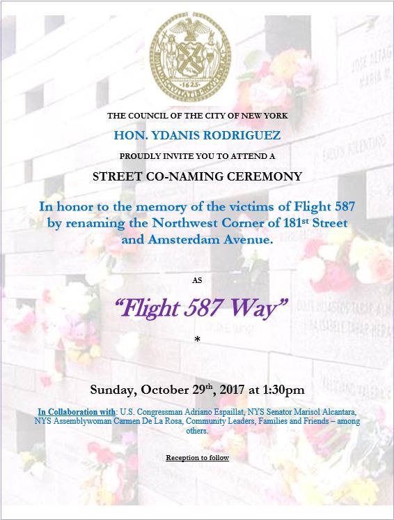 Councilman Ydanis Rodriguez, U.S. Congressman Adriano Espaillat, NYS Senator Marisol Alcantara, NYS Assemblywoman Carmen De La Rosa, Community Leaders, family and friends - among others - to unveil "Flight 587 Way" with a street co-naming ceremony in honor to the memory of the 265 victims of this tragic accident.