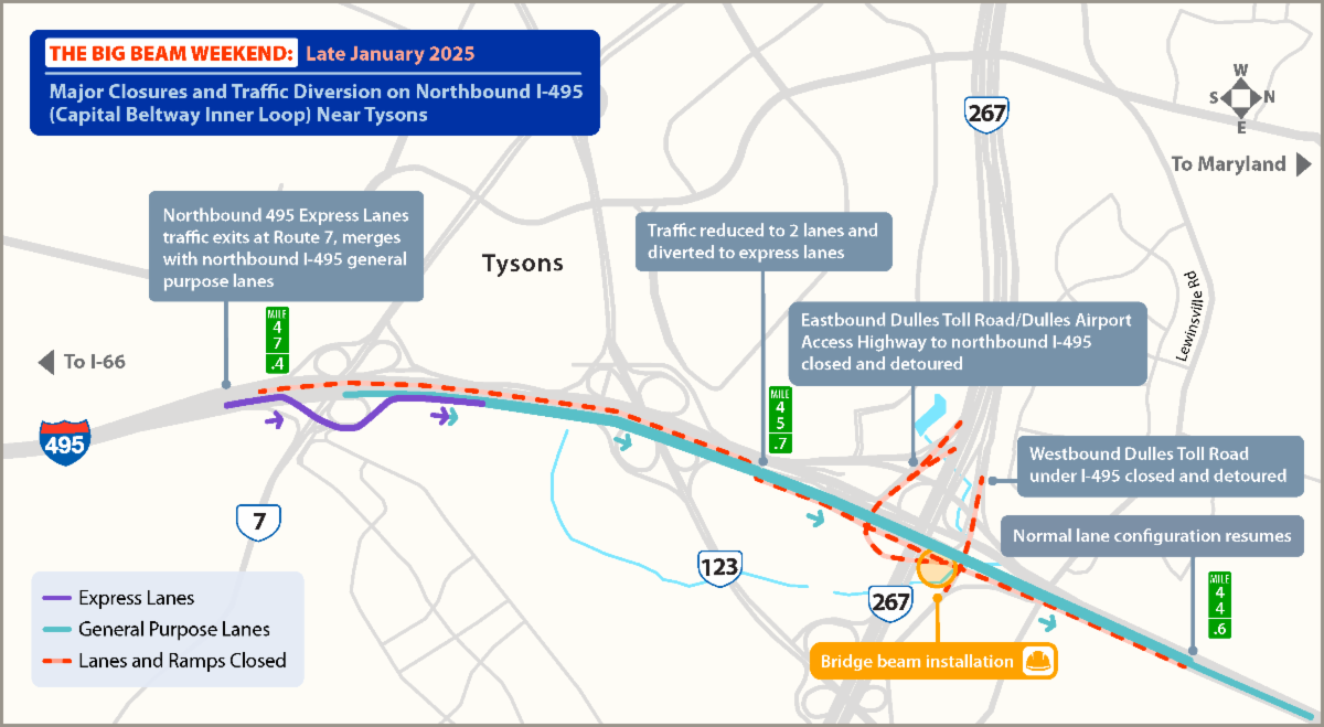 As part of the 495 NEXT project, crews will install steel bridge girders over northbound I-495 at the Dulles Corridor Interchange, requiring significant traffic changes. From 9:00 pm Friday, January 24th, to 5:00 am Monday, January 27th, traffic will be reduced to two lanes and shifted to the 495 Express Lanes for about one mile near Tysons. Lane reductions will affect a three-mile stretch from the Route 7 interchange to just past Lewinsville Road.