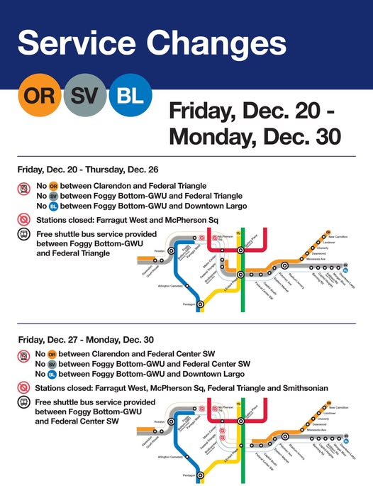 WMATA will begin work to keep the Metro running smoothly beginning December 20th through the 30th. The blue, orange, and silver line stations in the downtown area will be closed for major maintenance projects. Free shuttles will replace trains. | |