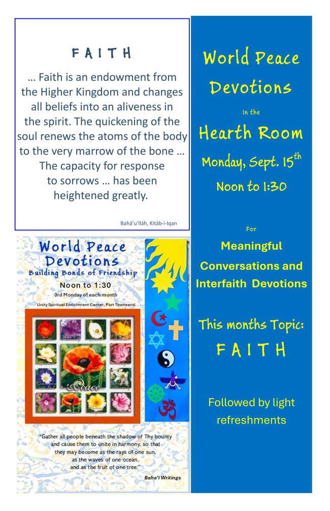 Bahai's of Jefferson County meet on the 3rd Mondays at UNITY. All are welcome to join them for Devotions, Music & Prayers for World Peace. noon till 1:30 pm. Join us for meaningful conversations, music and prayer on the 15th at Noon…