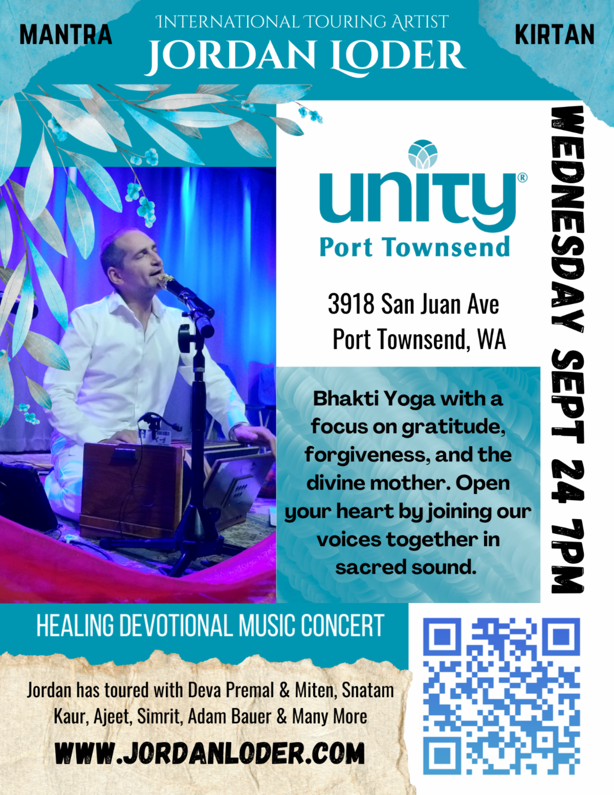 Sept 24 7pm Kirtan with International Touring Kirtan Artist Jordan Loder. "My kirtan sessions focus on forgiveness, gratitude, and compassion and incorporate both buddhist and sanskrit mantras, as well as a few stories from my time over the past decade touring with artists like Snatam Kaur, Deva Premal and Miten, Simrit, and Adam Bauer".