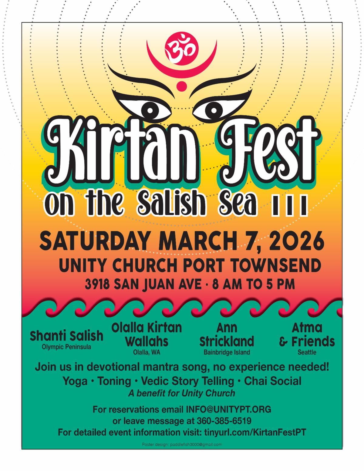KirtanFest is an all day celebration of Kirtan on the Salish Sea. This event takes place in Port Townsend, WA, a historic maritime and arts community, at the Unity Spiritual Enrichment Center for whom this event is an annual fundraiser. Kirtan will be offered by four regional Kirtan groups with yoga, toning, vedic story telling and the Hanuman Chalisa offered in between Kirtan sets. All of the Kirtan musicians will join together for a grand bhakti finale. Bring your own lunch or go out to one of the many restaurants in town. Come immerse yourself in the joy and bhav of five hours of live, from the heart Kirtan in community.