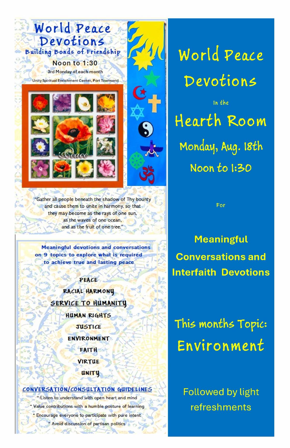 Bahai's of Jefferson County meet on the 3rd Mondays at UNITY. All are welcome to join them for Devotions, Music & Prayers for World Peace. noon till 1:30 pm.