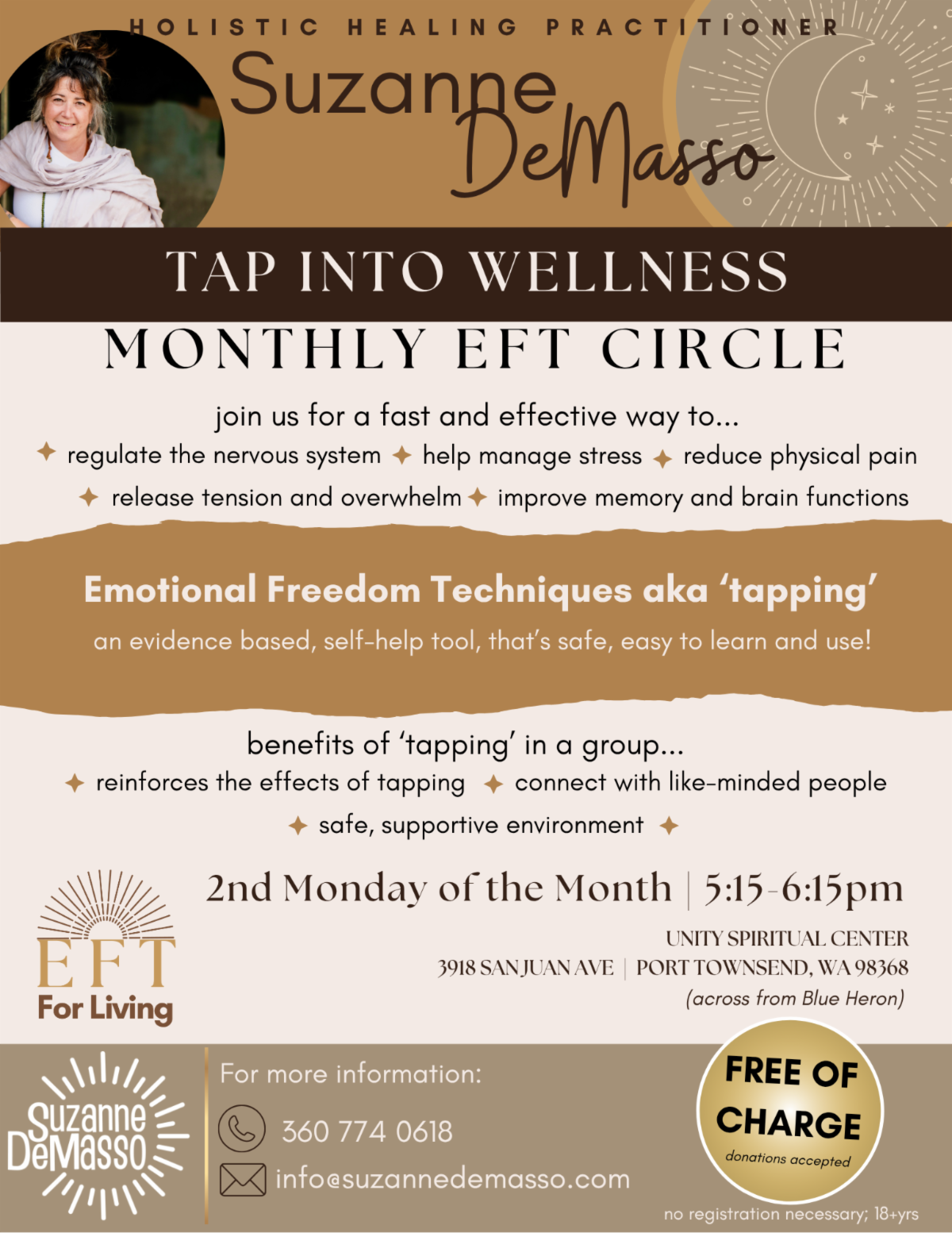 Tap into Wellness, Monthly EFT Circle every 2nd Monday of the month 5:15-6:15 pm meets in the Hearth Room at Unity. Join Suzanne DeMasso for a fast and effective self-help tool. see the Flyer below.
