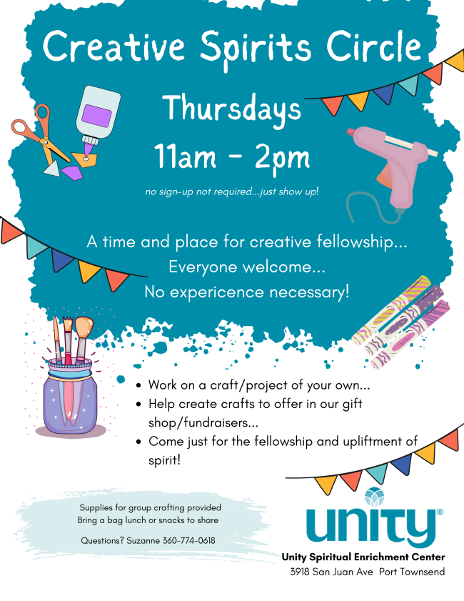 Unity Creative Spirits Circle meets every Thursday from 11am till 2pm. No sign-up needed, just drop in!! Bring a bag lunch or shared snack item and let the Fun Begin!! See the new Craft shelves at the Unity Bookstore.