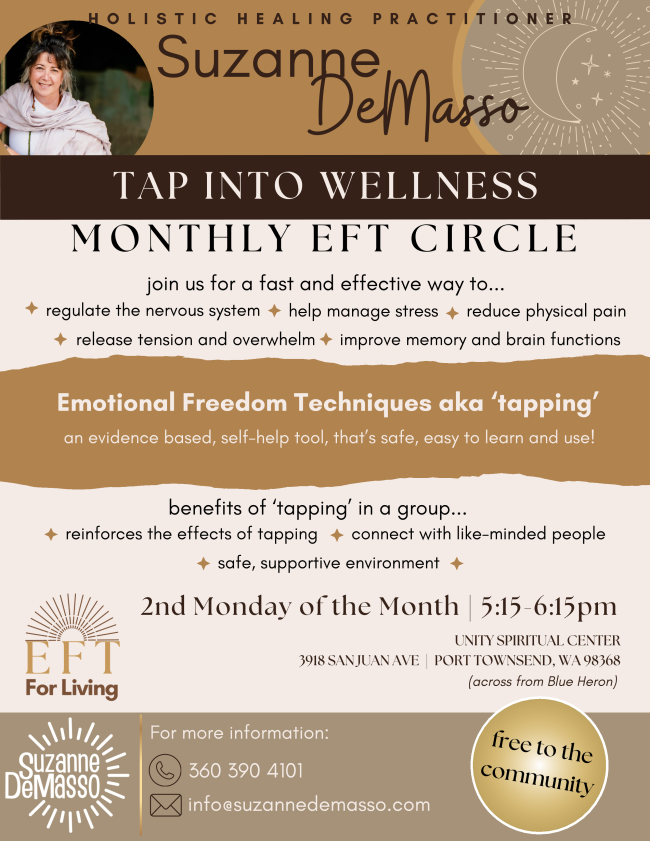 Tap into Wellness, Monthly EFT Circle April 14 and every 2nd Monday of the month 5:15-6:15 pm meets in the Hearty Room at Unity. Join Suzanne DeMasso for a fast and effective self-help tool. see Flyer!