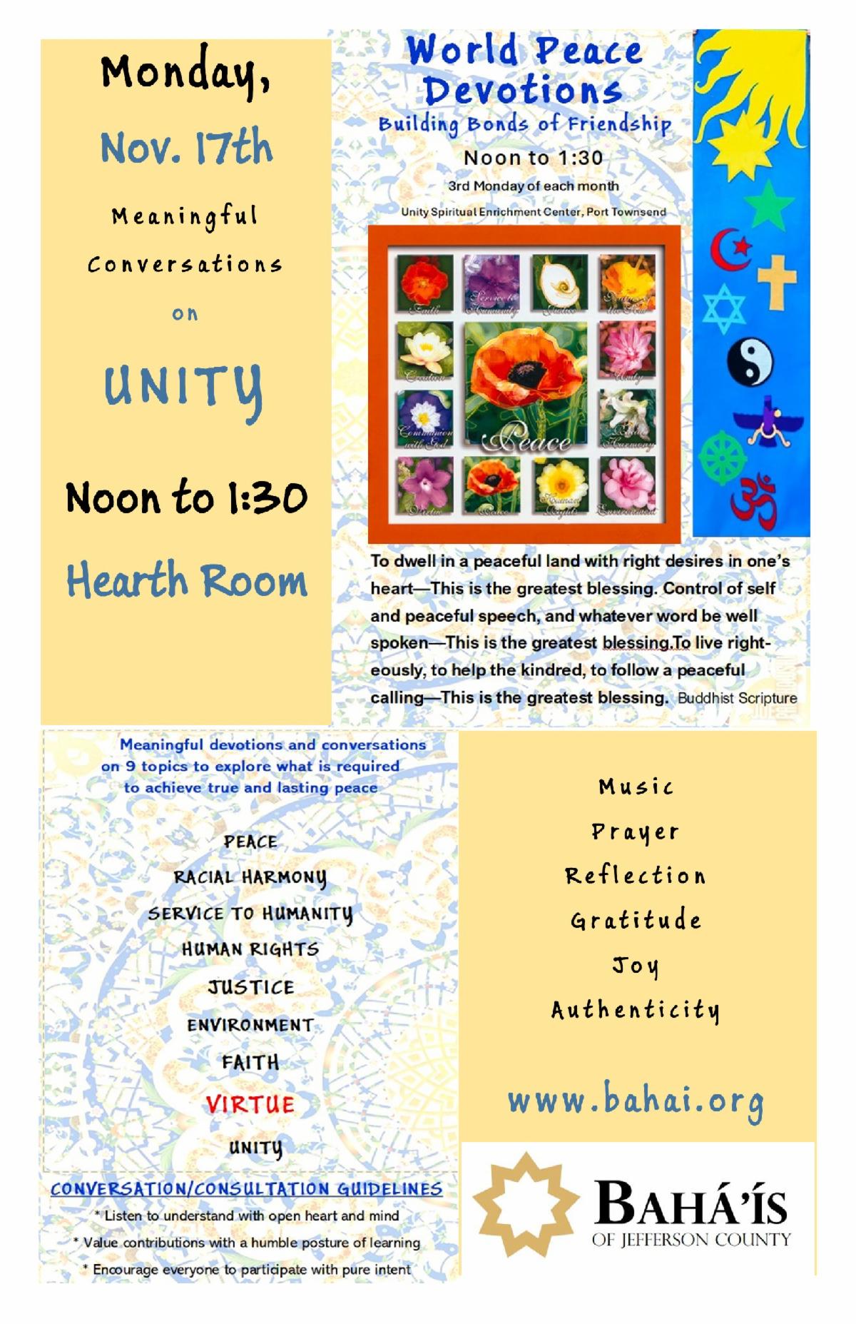 Yogananda Meditation meets Mondays at 3 PM (New Time!) - UNITY's Prayer Chapel or the Hearth Room. Call Michael at 360-390-8630. They begin with 1/2 hour of Kirtan Chanting.
