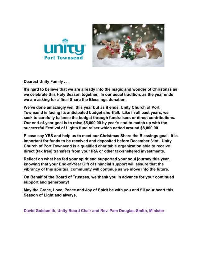 Yogananda Meditation meets Mondays at 3 PM (New Time!) - UNITY's Prayer Chapel or the Hearth Room. Call Michael at 360-390-8630. They begin with 1/2 hour of Kirtan Chanting.
