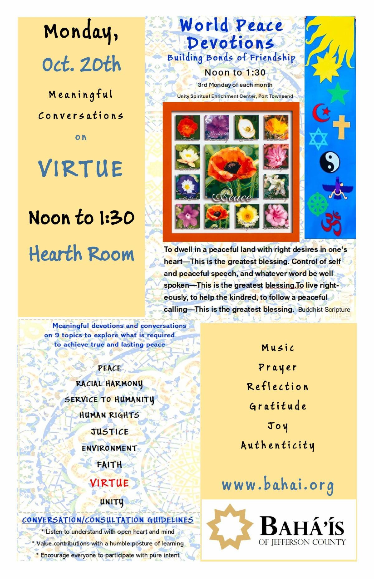Bahai's of Jefferson County meet on the 3rd Mondays at UNITY. All are welcome to join them for Devotions, Music & Prayers for World Peace. noon till 1:30 pm. Join us for meaningful conversations, music and prayer on the 15th at Noon…