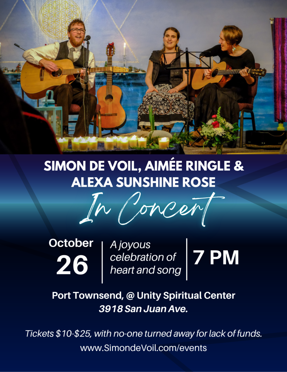 Join musicians Simon de Voil, Alexa Sunshine Rose & Aimée Ringle for this joyous, co-created celebration of heart and song at the Unity Spiritual Center in Port Townsend, WA on Sunday, October 26th at 7pm.