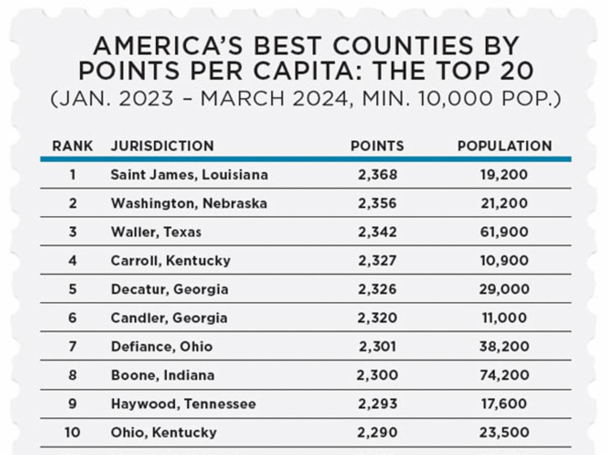 The rankings are based on total points awarded to counties based on number of projects between Jan. 2023 and March 2024, capital investment and jobs created.