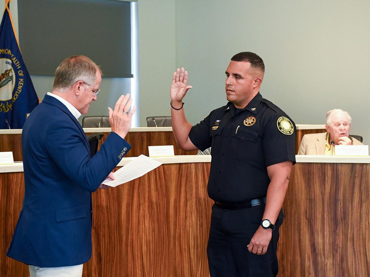 Kenton County Judge/Executive Kris Knochelmann swears in Trey Smith as the Kenton County Detention Center's new Chief Deputy of Operations. At far right is Commissioner Jon Draud. | |