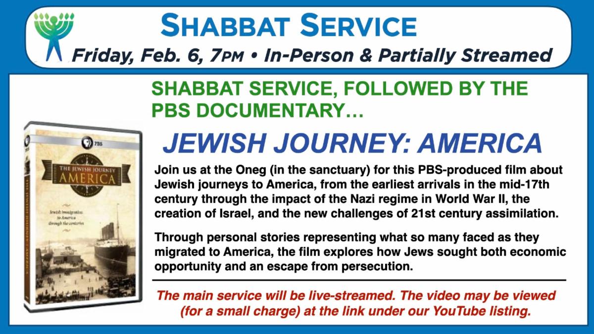 Join us at the Oneg Shabbat (to be held in the sanctuary) for this PBS-produced film about Jewish journeys to America, from the earliest arrivals in the mid-17th century through the impact of the Nazi regime in World War II, the creation of Israel, and the new challenges of 21st century assimilation.