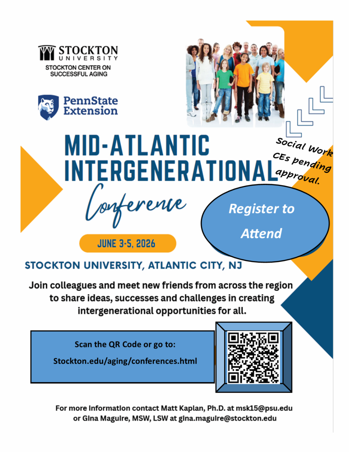 The Stockton Center on Successful Aging, in collaboration with Penn State, is hosting the 2nd Biennial Mid-Atlantic Intergenerational Conference on June 3-5, 2026 in Atlantic City.
