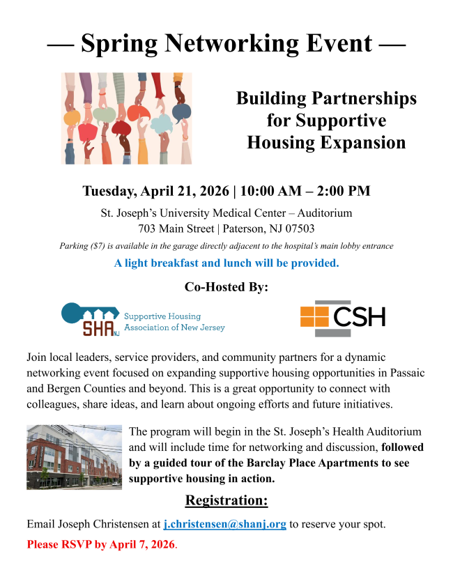 Join local leaders, service providers, and community partners for a dynamic networking event focused on expanding supportive housing opportunities in Passaic and Bergen Counties and beyond. This is a great opportunity to connect with colleagues, share ideas, and learn about ongoing efforts and future initiatives.
