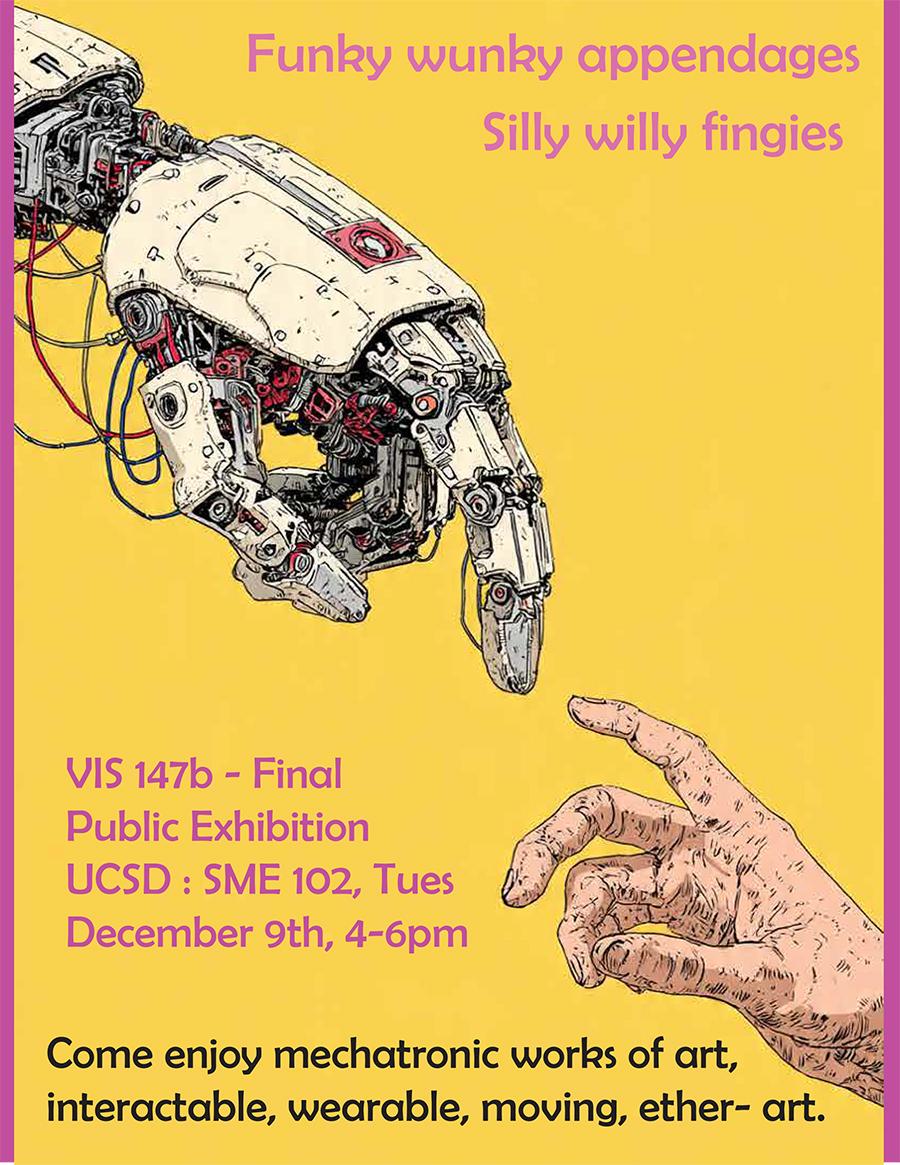 Come enjoy mechatronic works of art, interactable, wearable, moving, ether- art. This class designs programmable microcontroller systems for creating artworks that are able to respond to complex sets of input conditions, perform algorithmic and procedural processing, and generate real time output. Instructed by MFA alum Jonathon Paden.