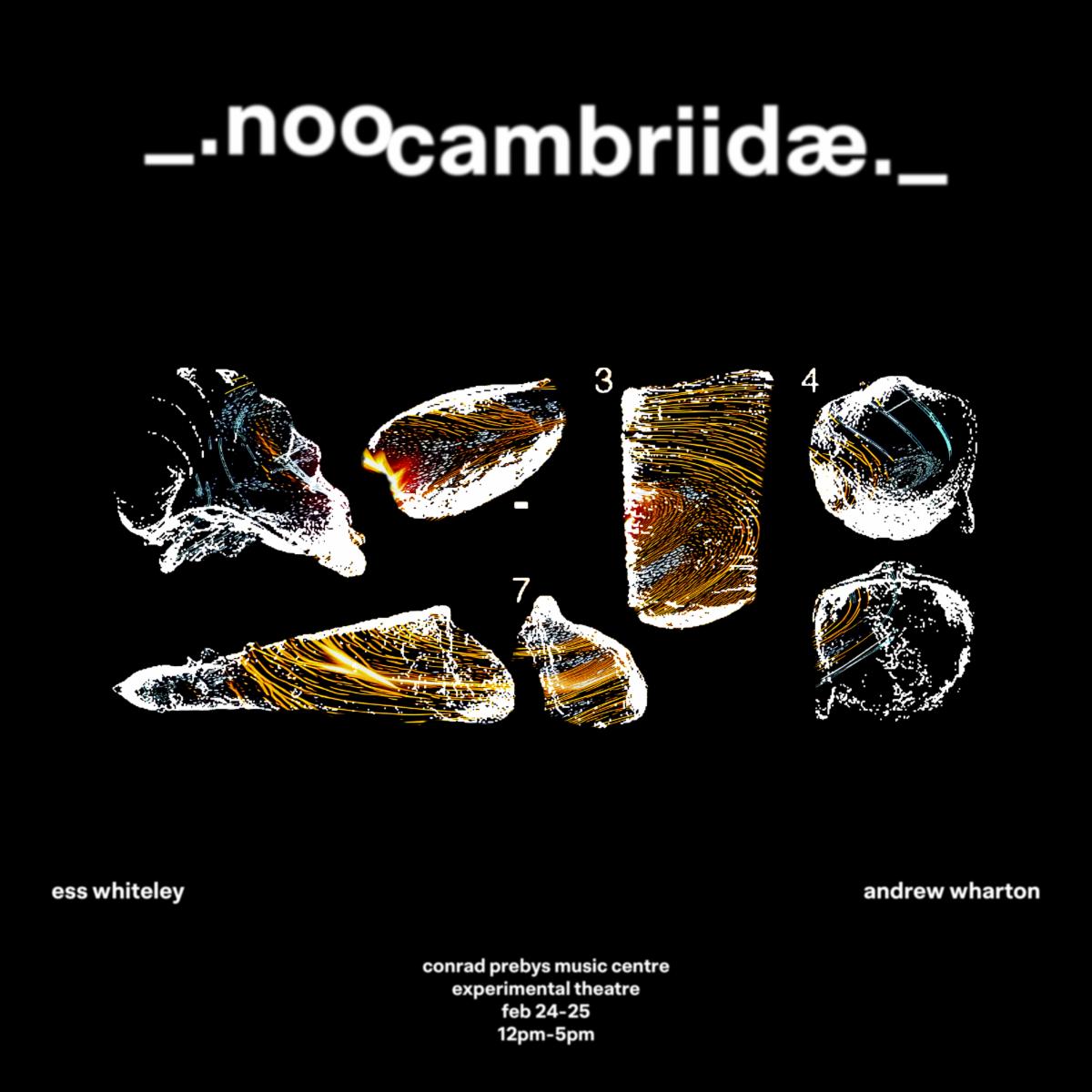 _.noocambriidæ._ is a collaborative audiovisual work from Music PhD student ess whiteley and Andrew Wharton. Through 3D animation and 8-channel spatialized interactive sound, _.noocambriidæ_. acts as a nooscope into this realm of more-than-human behaviours and transmutations.
