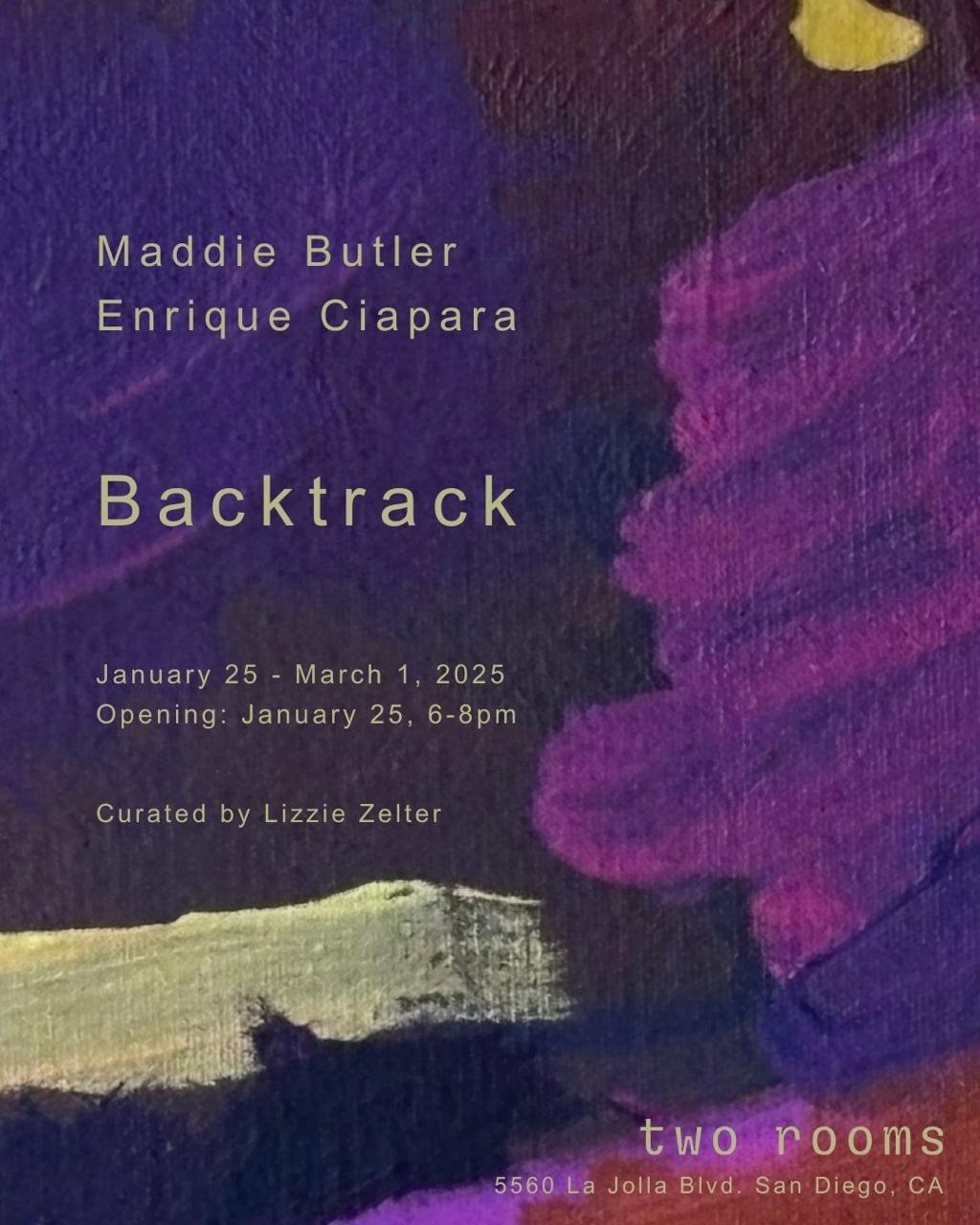 Two Rooms is proud to present Backtrack, a two-person exhibition featuring Maddie Butler and Enrique Ciapara. Through assemblage and painting, Butler and Ciapara mediate images of everyday experiences into forms that reveal the imperfections of the hand.