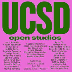 This is our opportunity to share with you and the San Diego community our research, scholarship, and artistic practices. Open Studios will feature over 25 MFA & PhD artists' open studios, exhibitions, screenings, and publications produced in the Department of Visual Arts. The artists will be present in their studios throughout the afternoon and excited to talk about and share their work with you.