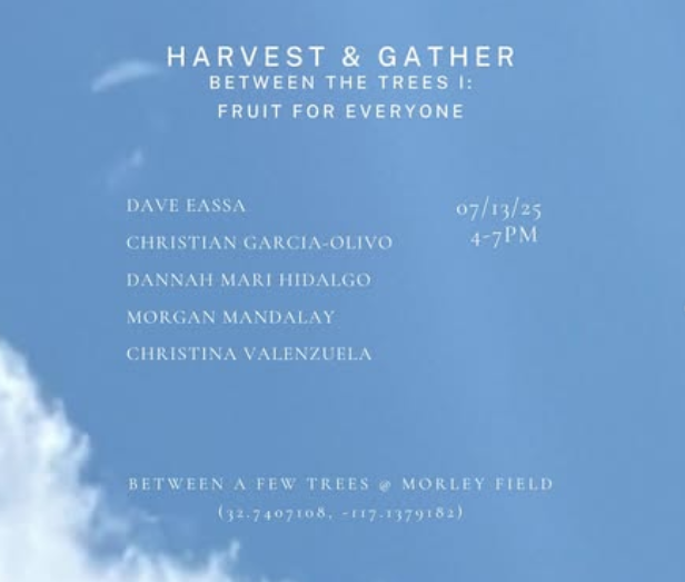 Between the Trees I: Fruit for Everyone is curated by Harvest & Gather, an independent curatorial project by MFA alumni Cat Gunn & mika Castañeda. At the core of these exhibitions is a simple gesture, paintings in a park. Embracing the picnic as a vital system of care, rest, and rejuvenation, Between the Trees invites artists to share space, shade, and their work under the open sky.