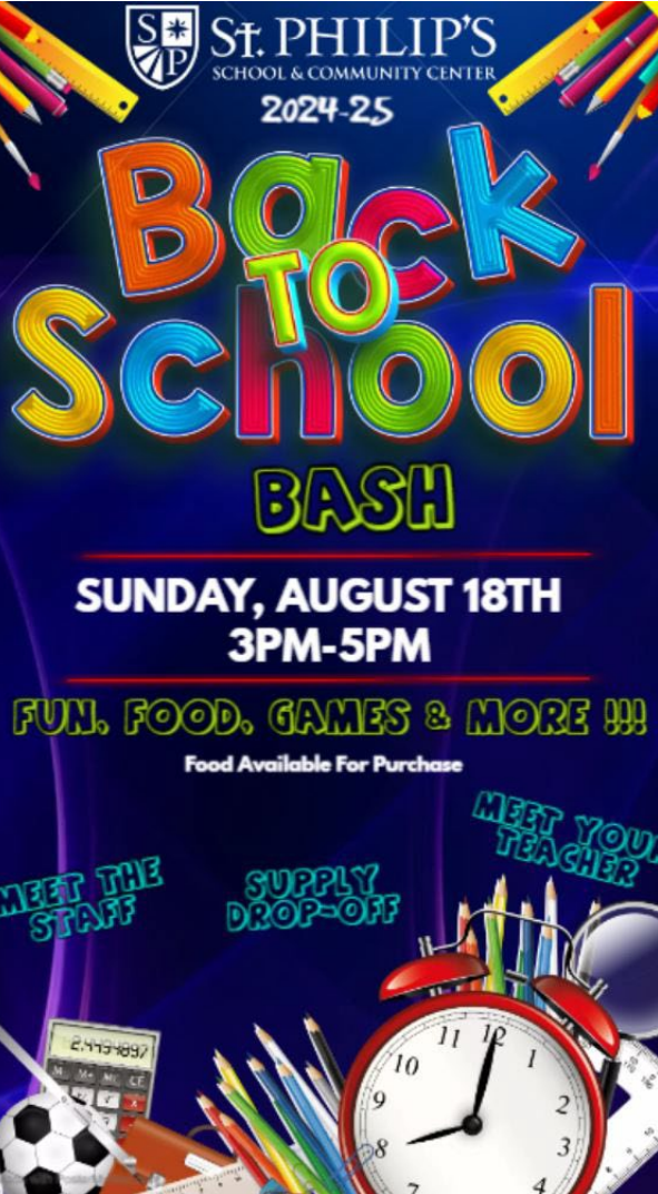 St. Philip's School and Community Center is thrilled to invite families to its annual Back to School Bash on Sunday, August 18th, from 3 PM to 5 PM. This exciting event will feature a variety of fun activities, including games, delicious food available for purchase, and the chance to meet the school's dedicated staff and teachers. Families can also take advantage of the convenient supply drop-off area to bring in school supplies before the first day of school. It's a perfect opportunity to celebrate the upcoming school year, connect with the community, and ensure a smooth start to the academic year.