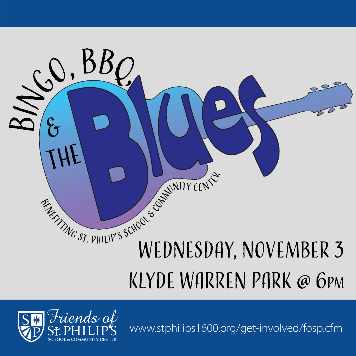We are excited to announce our new venue for Bingo BBQ, & the Blues, the rescheduled inaugural fundraising event for Friends of St. Philip’s. The event will be held on Wednesday, November 3rd from 6-10pm at Klyde Warren Park with Laura Harris of NBC 5 and Chris Arnold from the Mavericks as emcees. Music will be provided by Nashville blues musician, Sam Johnston. Local "celebrity" callers will be on hand to make bingo even more fun. If you already purchased a table or individual tickets, your purchase will be honored at the rescheduled event. Tickets and Tables are available for purchase here.